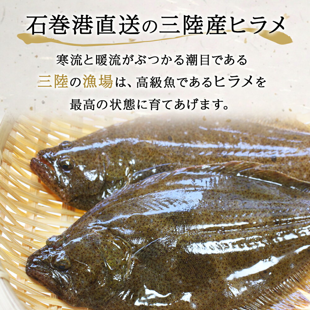 〜石巻港直送の三陸産ヒラメ〜 寒流と暖流がぶつかる潮目である三陸の漁場は、高級魚であるヒラメを最高の状態に育てあげます。