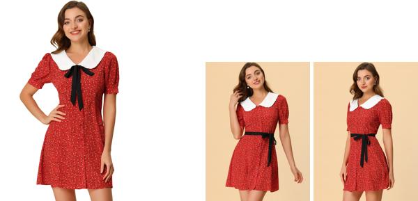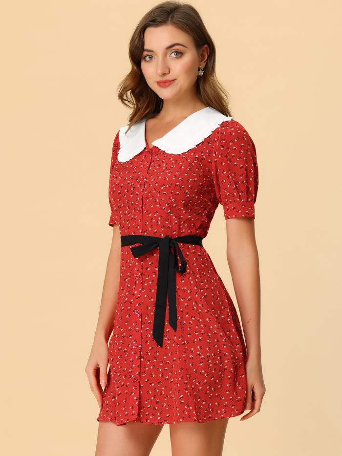 フレアスカートを備えたこの膝上丈のスタイルはバストとウエストに取り付けられていますこのなめらかな織りのミニドレスはフリルのコントラストの襟と短いバブルスリーブを弓で覆う新鮮な花柄のプリントです。