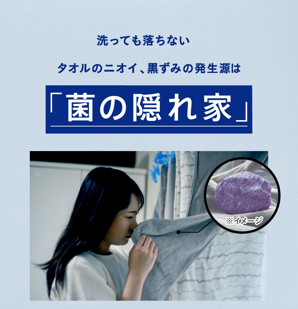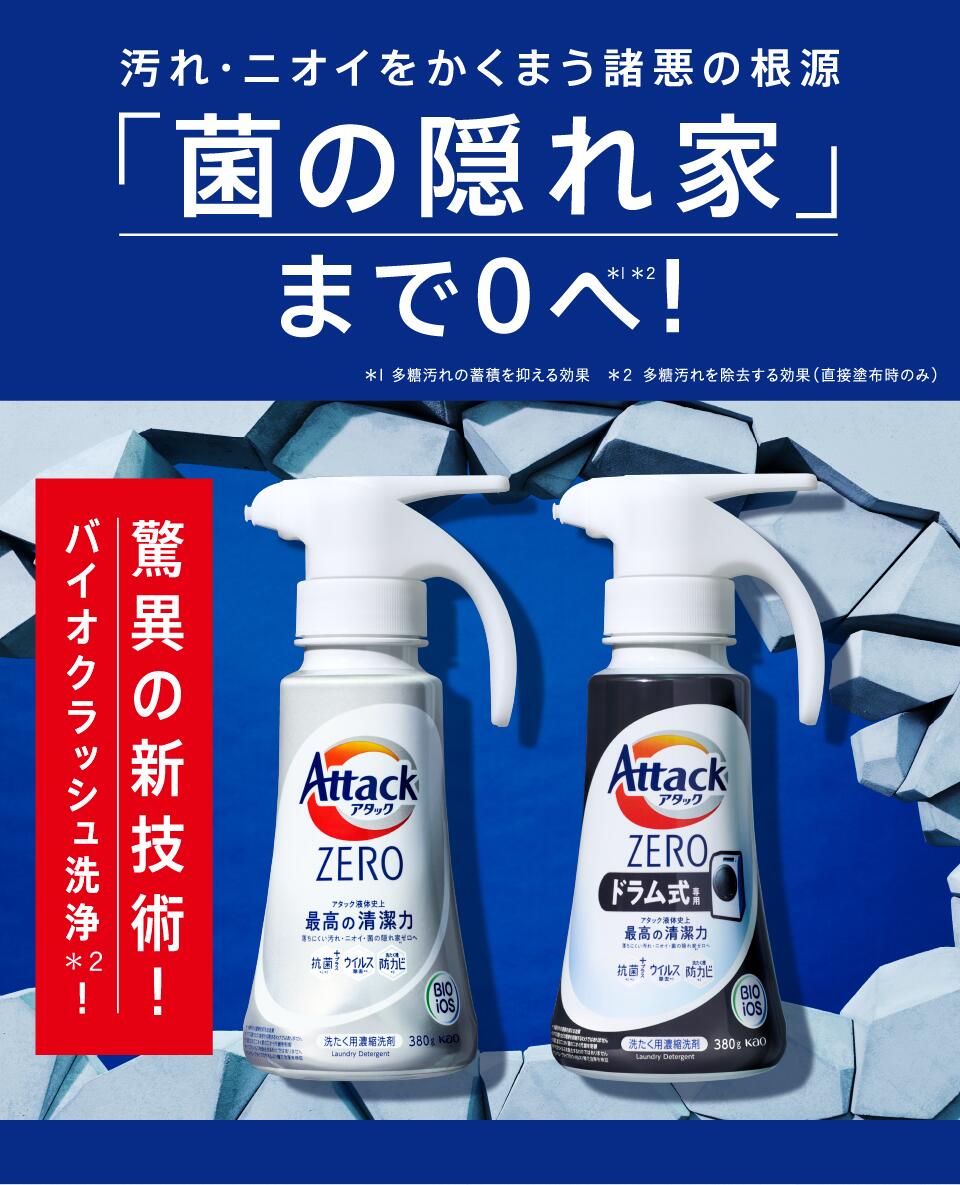 > 商品特長 洗たく回数※ ※洗たく物2 kg(洗剤10g使用)の場合 特大85回分 ドラム式専用洗剤 ドラム式特有の少ない水でもニオイ徹底除去 アタック液体史上最高の清潔力 落ちにくい汚れ0へ 生乾き臭0へ 菌の隠れ家まで0へ*1 ニオイ・黒ずみの発生源を解決! *1 多糖汚れの蓄積を抑える効果 *2 すべての菌・カビの増殖を抑制するわけではありません。