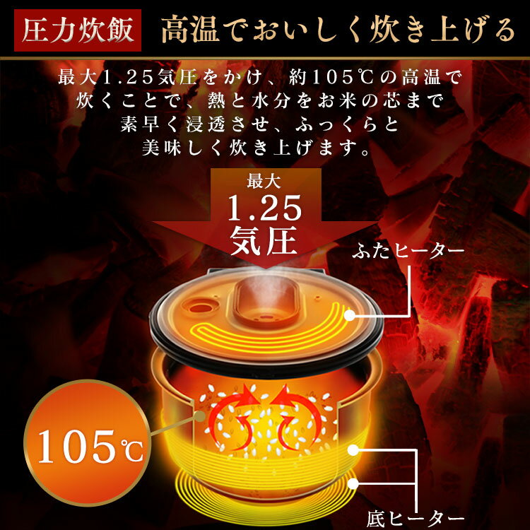 ◆圧力炊飯最大1.25気圧をかけ、約105℃の高温で炊くことで熱と水分をお米の芯まで素早く浸透させふっくらと美味しく炊き上げます。