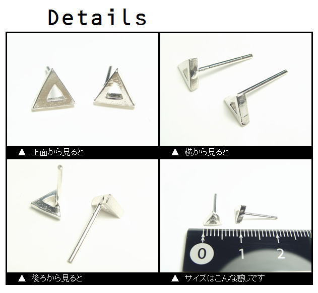 →別売シルバー925キャッチはこちらから!素材シルバー925サイズ三角形の1辺の長さ:約5mmポスト長さ:約10mm 個数ペアー売り(1組2個セット)耳にやさしいシリコンゴムキャッチ付き特徴中が空洞になっているタイプ。