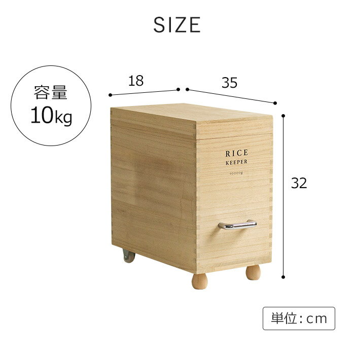 SIZE  サイズ 商品名 米びつ 10kg キャスター付き 技物専科 サイズ 約 幅18×奥行35cm×高さ32cm 原材料 天然木(桐/無塗装)、樹脂、金属 容量 10kg 備考 キッチン雑貨 ランキング